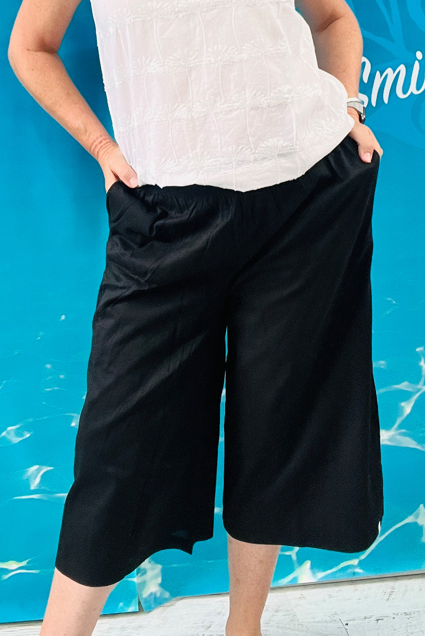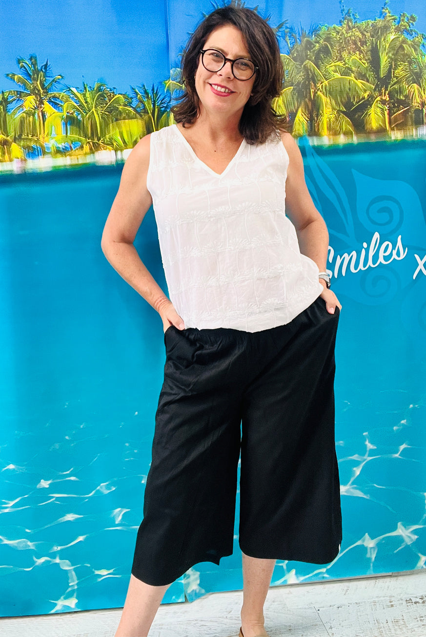 These pants are available in basic black or white, so you can wear them on the beach with your black swimmers or out to dinner with our sparkly SEQUIN palm tree top. Click here to find it. So versatile, and so comfortable. Smarten up your vacation with our evening wear, island girls.