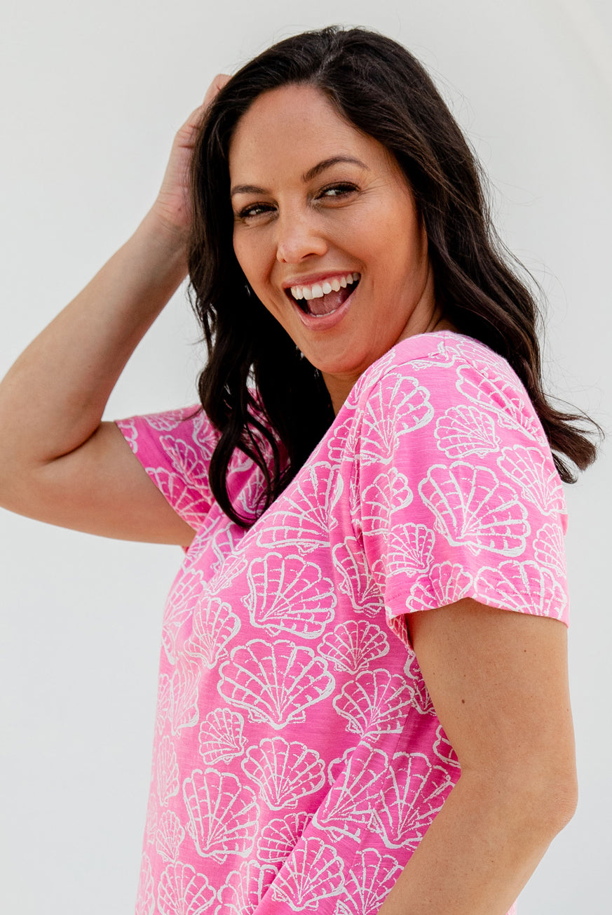 The V-neckline is flattering, especially for those of us that are big busted, and when you combine the V-neckline with the curved shaped sides and cute short sleeves, you will love that fit, so SUPER flattering to wear.