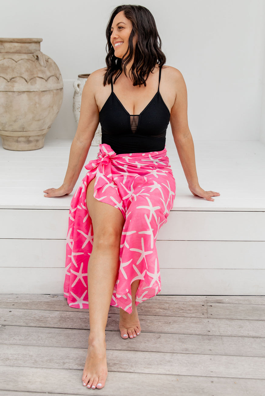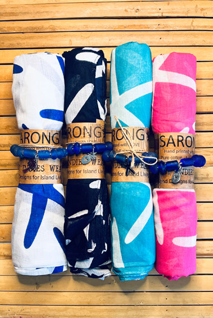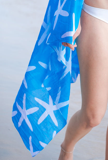 This starfish print takes us back to wear our brand started and remains one of our best sellers today. A sarong is an essential beach accessory, there are so many things you will end up using it for. Not just amazing different ways to wear it. You will be amazed how handy they are. Our sarongs are special because they are made from the softest lightweight pure cotton. (most sarongs are viscose) This is the lightest weight fabric in the collection.
