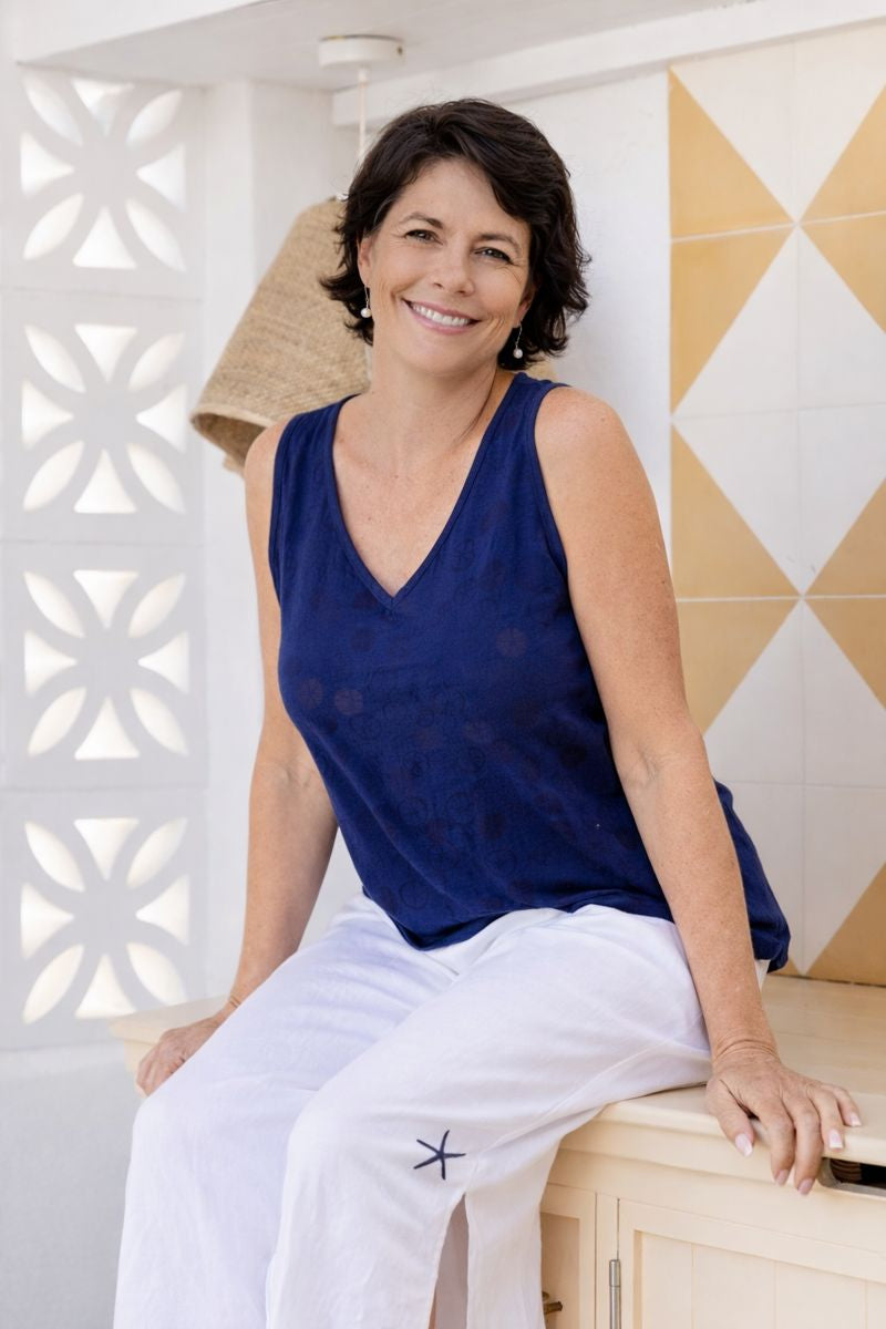A relaxed, sleeveless fit with a flattering scoop neckline. It’s designed to drape gently over the body without clinging — ideal for layering or wearing on its own.